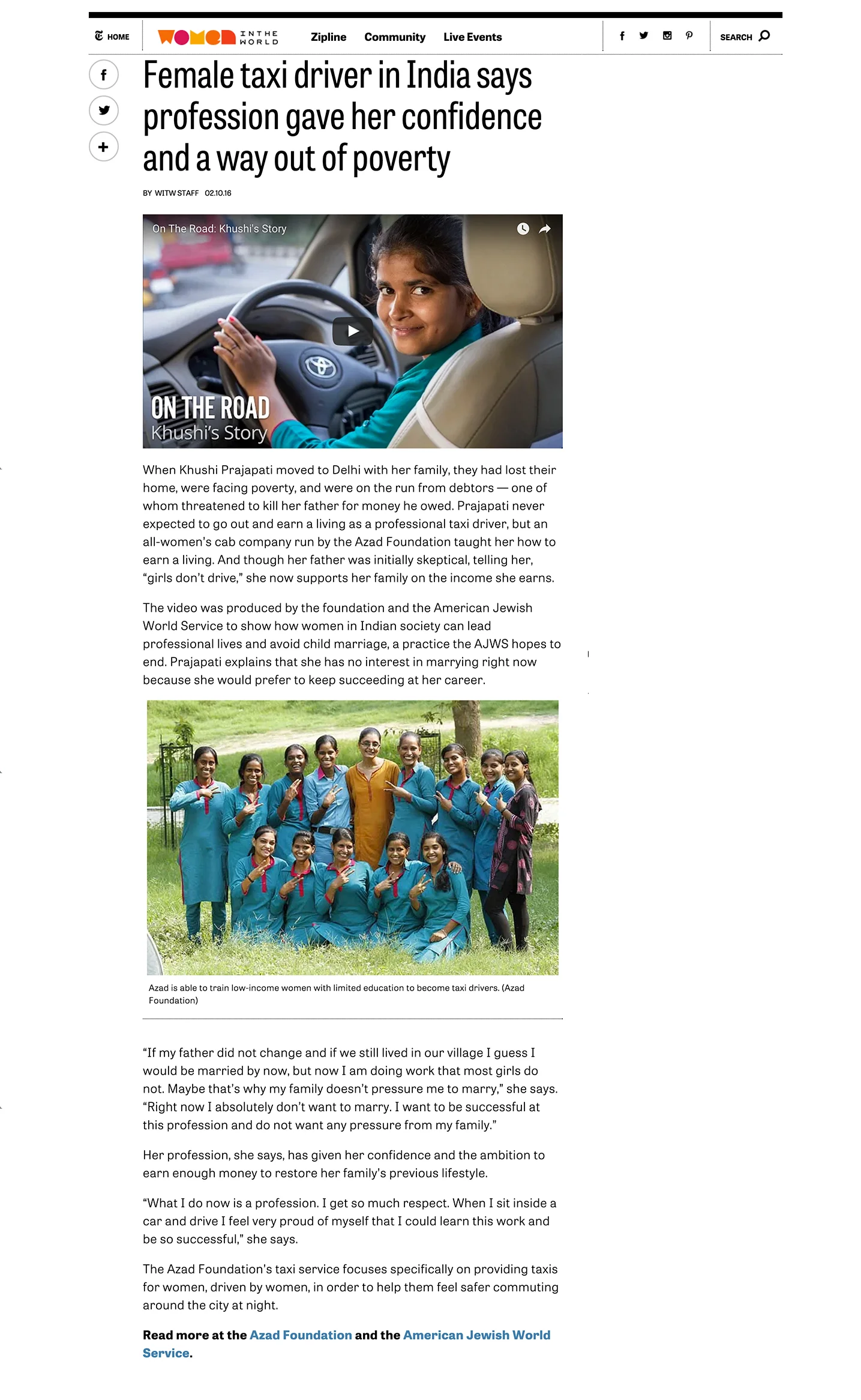 The American Jewish World Service recently released the second video for their Ending Child Marriage campaign. This video features Khushi Prajapati's story as a female taxi driver in the busy streets of Delhi, India. As part of a fleet of women taxi drivers, Khushi is an integral part of the Azad Foundation's approach to ending child marriage. Through Azad's training, women learn to drive, are trained in self-defense, and become financially independent, which enables them to avoid early child marriage.